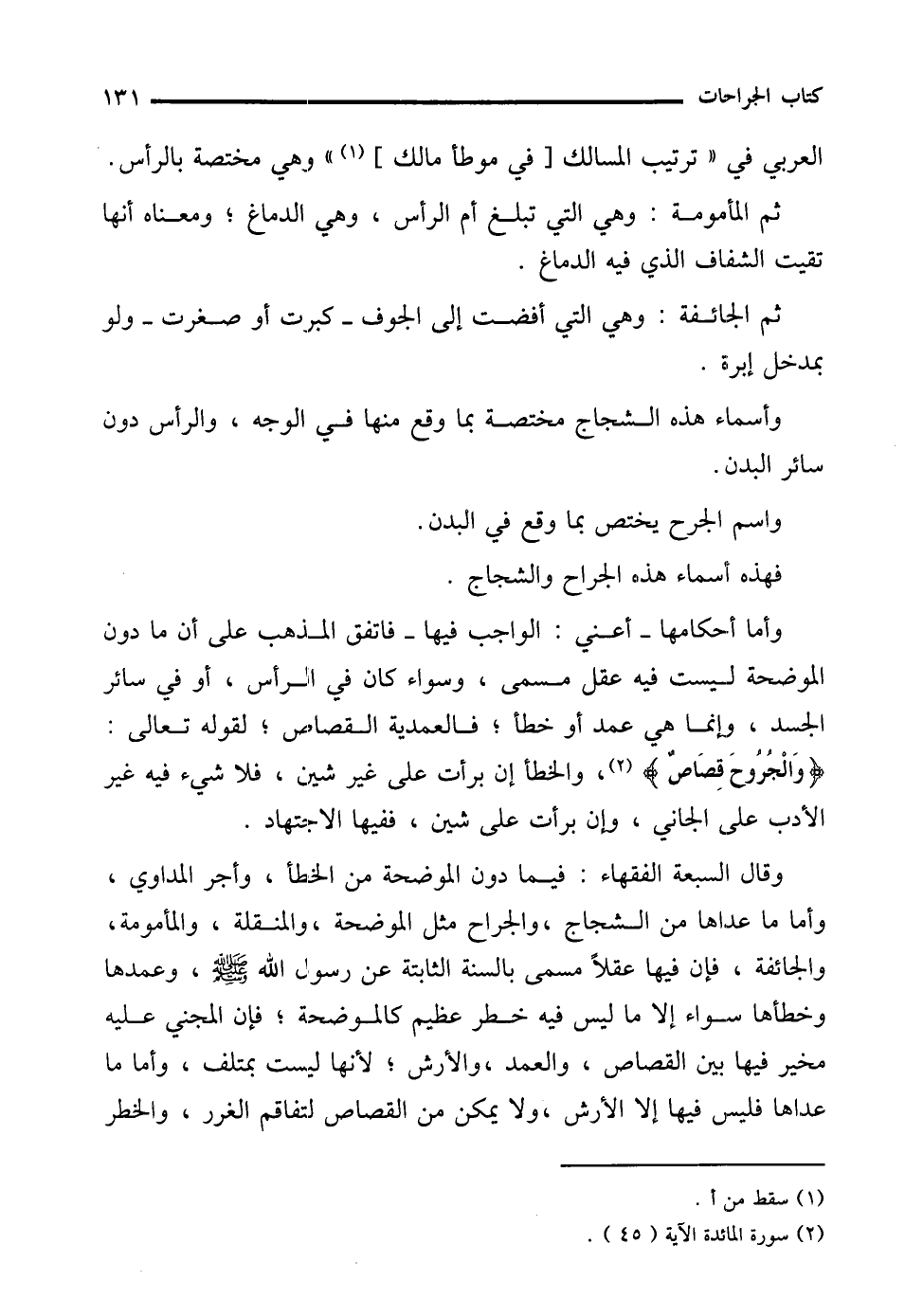 وقال السبعة الفقهاء: فيما دون الموضحة من الخطأ, وأجر المداوي, وأما ما عداها من الشجاج، والجراح مثل الموضحة، والمنقلة , والمأمومة, والجائفة، فإن فيها عقلًا مسمى بالسنة الثابتة عن رسول الله - صلى الله عليه وسلم - وعمدها وخطأها سواء إلا ما ليس فيه خطر عظيم كالموضحة؛ فإن المجني عليه مخير فيها بين القصاص، والعمد، والأرش؛ لأنها ليست بمتلف. وأما ما عداها فليس فيها إلا الأرش، ولا يمكن من القصاص لتفاقم الغرر, والخطر