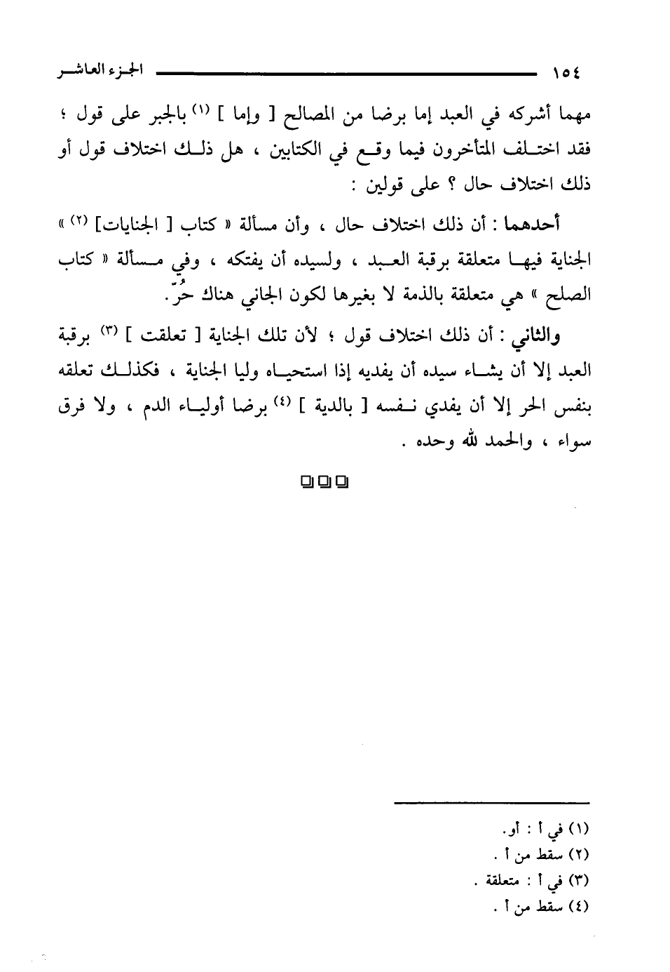 أحدهما: أن ذلك اختلاف حال، وأن مسألة "كتاب [الجنايات] (¬2) " الجناية فيها متعلقة برقبة العبد، ولسيده أن يفتكه، وفي مسألة "كتاب الصلح" هي متعلقة بالذمة لا بغيرها لكون الجاني هناك حُرّ.