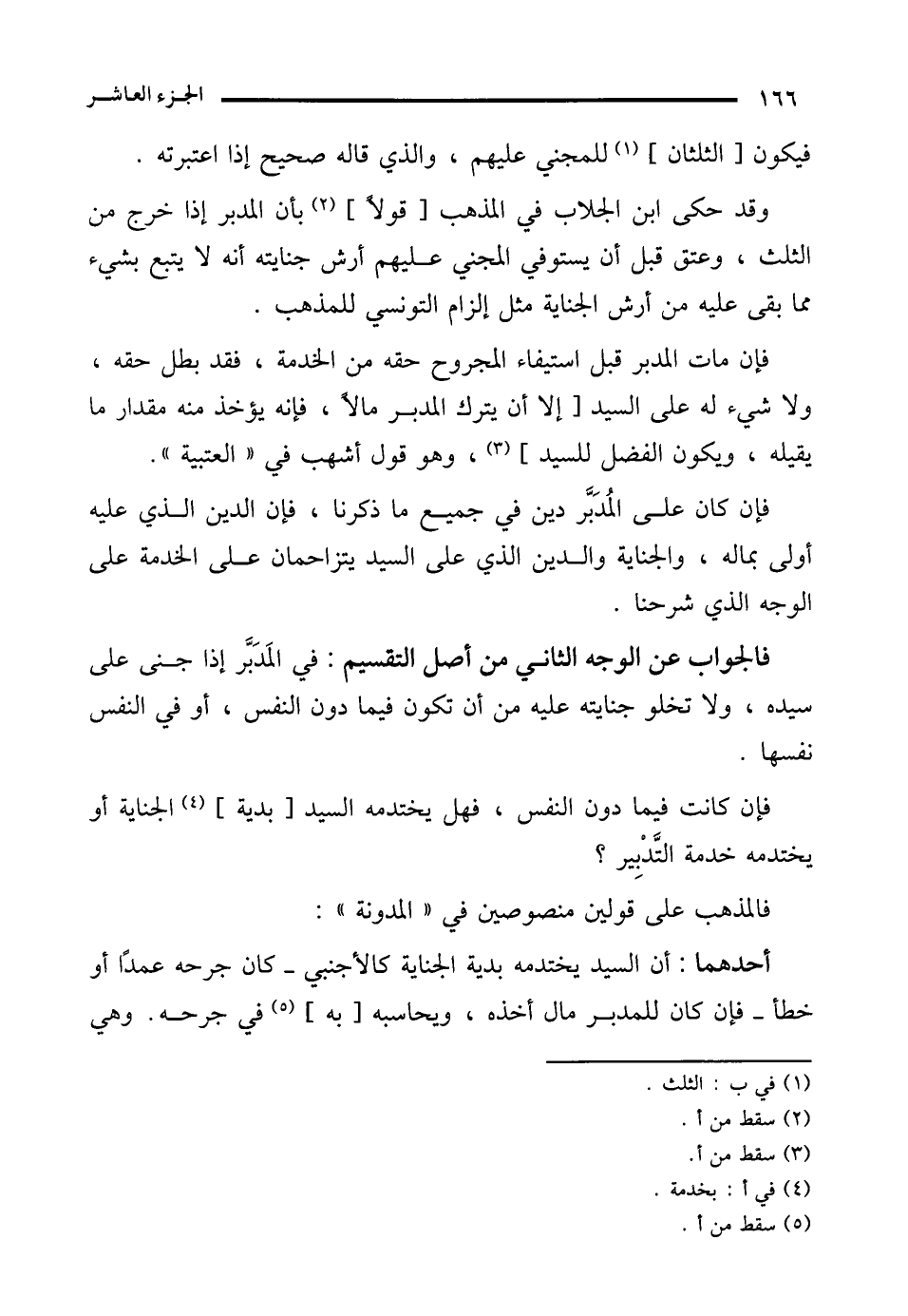 فالجواب عن الوجه الثاني من أصل التقسيم: في المَدَبَّر إذا جنى على سيده، ولا تخلو جنايته عليه من أن تكون فيما دون النفس، أو في النفس نفسها.