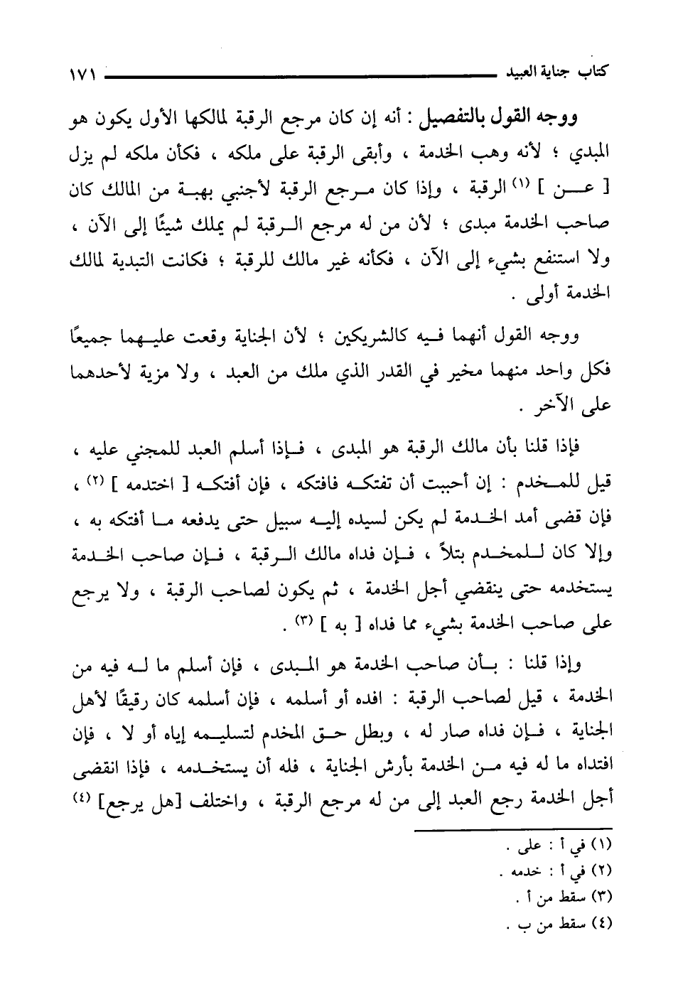 وإذا قلنا: بأن صاحب الخدمة هو المبدى، فإن أسلم ما له فيه من الخدمة، قيل لصاحب الرقبة: افده أو أسلمه، فإن أسلمه كان رقيقًا لأهل الجناية، فإن فداه صار له، وبطل حق المخدم لتسليمه إياه أو لا، فإن افتداه ما له فيه من الخدمة بأرش الجناية، فله أن يستخدمه، فإذا انقضى أجل الخدمة رجع العبد إلى من له مرجع الرقبة، واختلف [هل يرجع] (¬4)