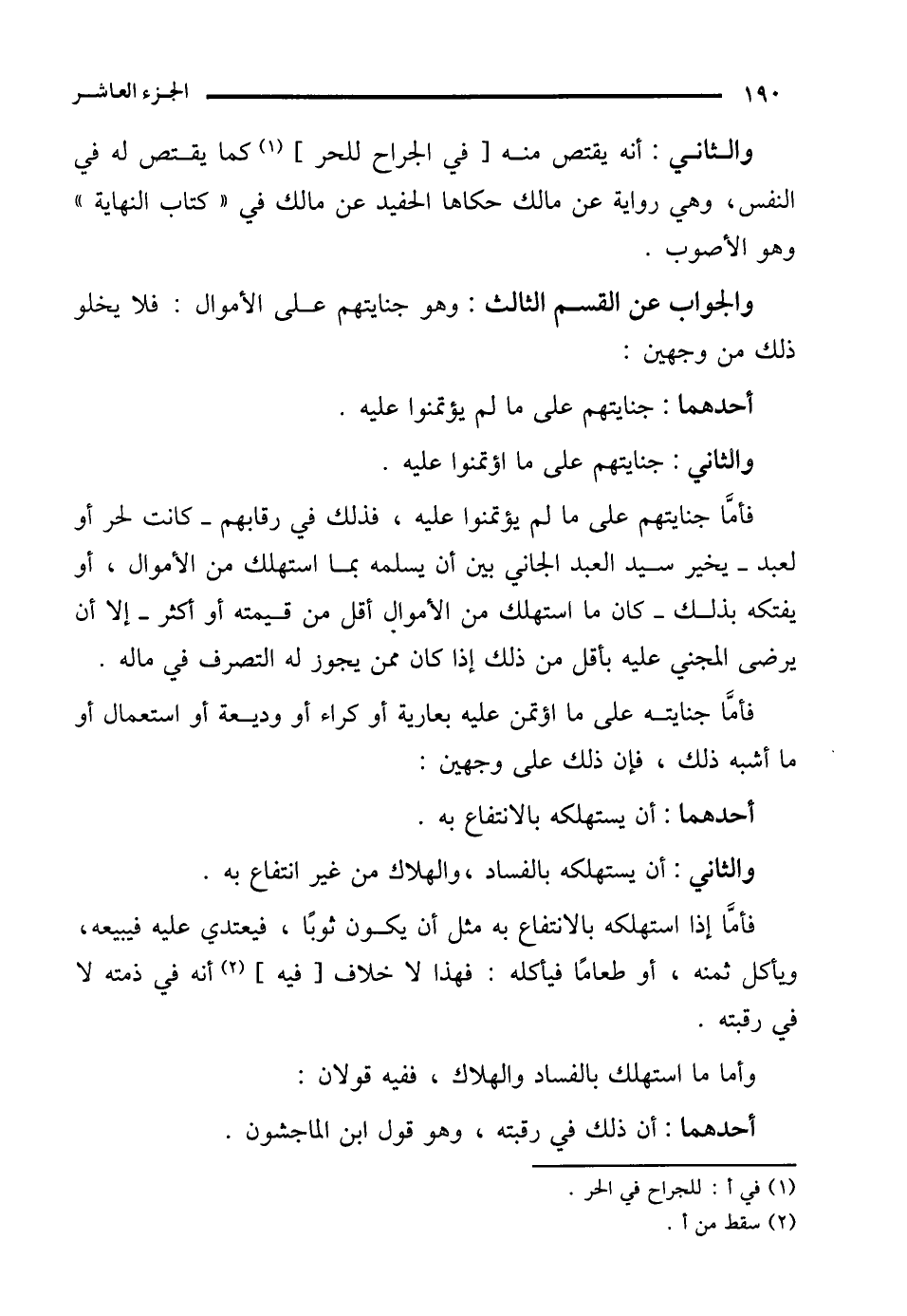 فأمَّا جنايتهم على ما لم يؤتمنوا عليه، فذلك في رقابهم -كانت لحر أو لعبد- يخير سيد العبد الجاني بين أن يسلمه بما استهلك من الأموال، أو يفتكه بذلك -كان ما استهلك من الأموال أقل من قيمته أو أكثر- إلا أن يرضى المجني عليه بأقل من ذلك إذا كان ممن يجوز له التصرف في ماله.