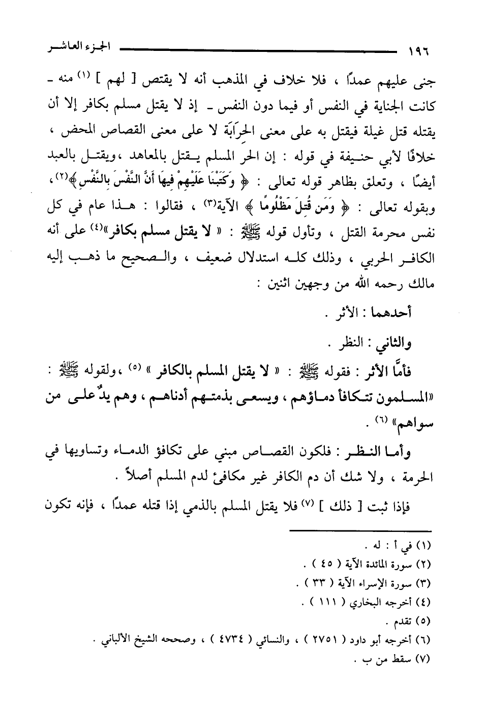 فأمَّا الأثر: فقوله - صلى الله عليه وسلم -: "لا يقتل المسلم بالكافر" (¬5)، ولقوله - صلى الله عليه وسلم -: "المسلمون تتكافأ دماؤهم، ويسعى بذمتهم أدناهم، وهم يدٌ على من سواهم" (¬6).