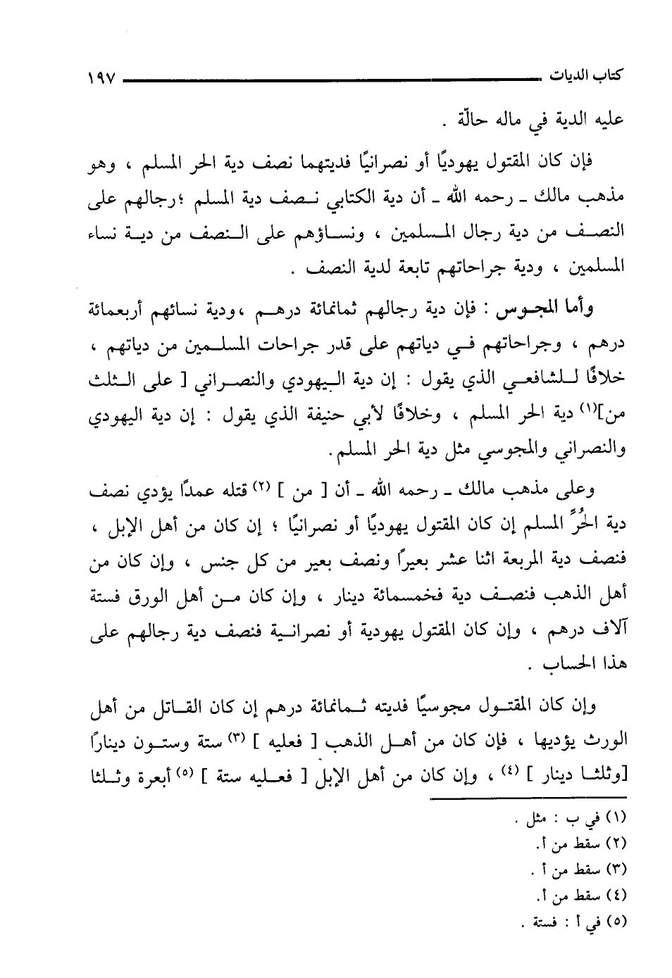وعلى مذهب مالك -رحمه الله- أن [من] (¬2) قتله عمدًا يؤدي نصف دية الحُرِّ المسلم إن كان المقتول يهوديًا أو نصرانيًا؛ إن كان من أهل الإبل، فنصف دية المربعة اثنا عشر بعيرًا ونصف بعير من كل جنس، وإن كان من أهل الذهب فنصف دية فخمسمائة دينار، وإن كان من أهل الورق فستة آلاف درهم، وإن كان المقتول يهودية أو نصرانية فنصف دية رجالهم على هذا الحساب.