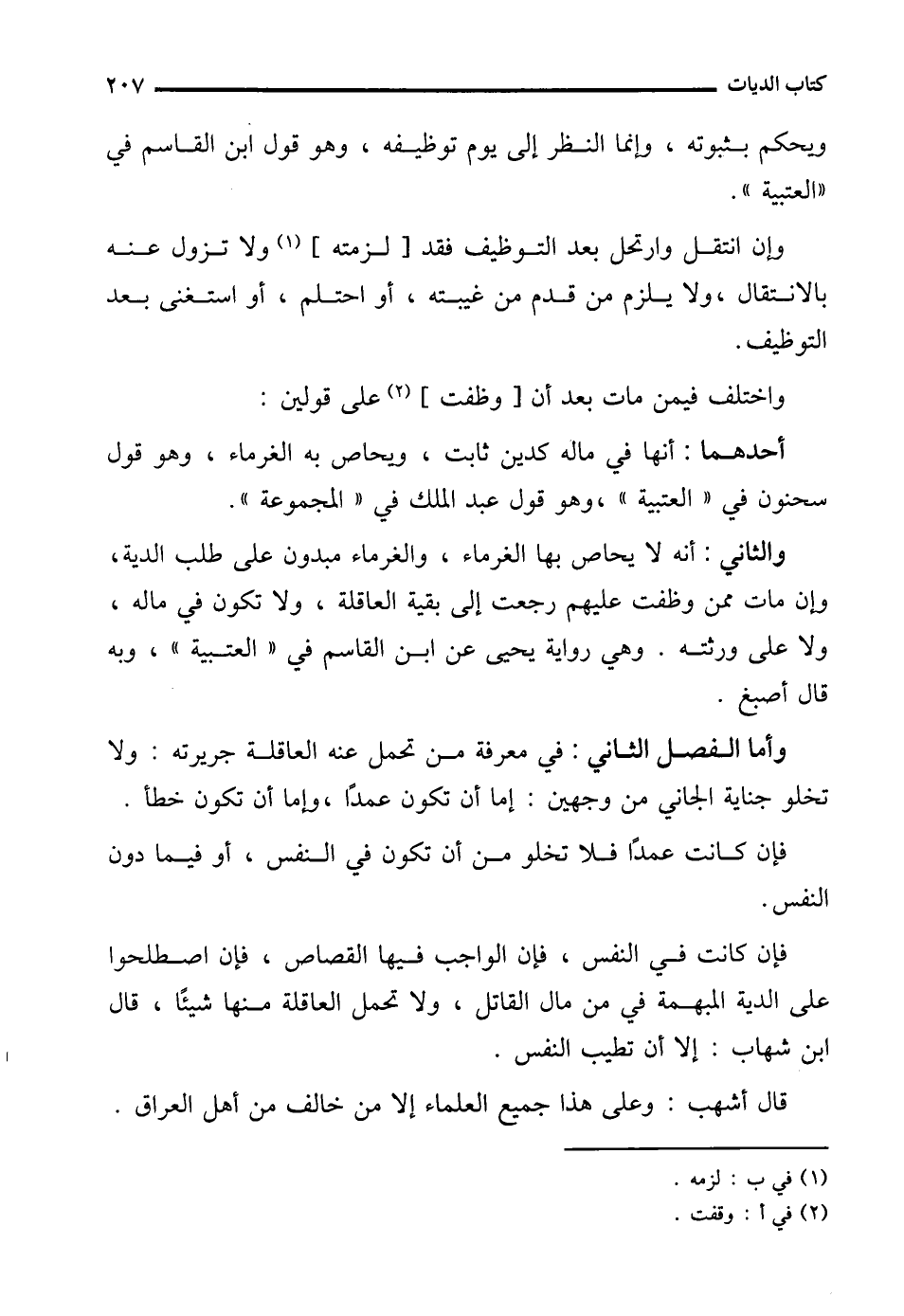 والثاني: أنه لا يحاص بها الغرماء، والغرماء مبدون على طلب الدية، وإن مات ممن وظفت عليهم رجعت إلى بقية العاقلة، ولا تكون في ماله، ولا على ورثته. وهي رواية يحيى عن ابن القاسم في "العتبية"، وبه قال أصبغ.