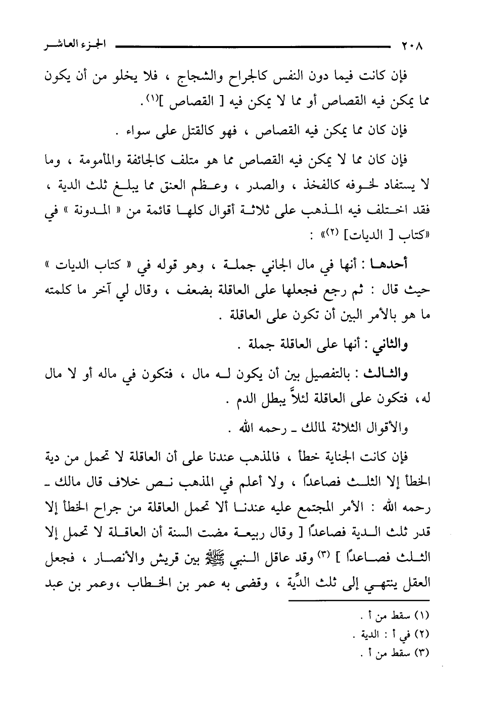 فإن كانت الجناية خطأ، فالمذهب عندنا على أن العاقلة لا تحمل من دية الخطأ إلا الثلث فصاعدًا, ولا أعلم في المذهب نص خلاف قال مالك -رحمه الله: الأمر المجتمع عليه عندنا ألا تحمل العاقلة من جراح الخطأ إلا قدر ثلث الدية فصاعدًا [وقال ربيعة مضت السنة أن العاقلة لا تحمل إلا الثلث فصاعدًا] (¬3) وقد عاقل النبي - صلى الله عليه وسلم - بين قريش والأنصار، فجعل العقل ينتهي إلى ثلث الدِّية، وقضى به عمر بن الخطاب، وعمر بن عبد