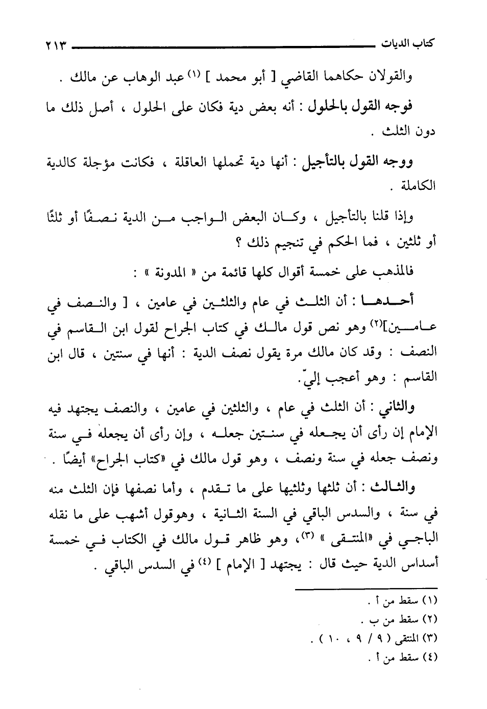 والثالث: أن ثلثها وثلثيها على ما تقدم، وأما نصفها فإن الثلث منه في سنة، والسدس الباقي في السنة الثانية، وهو قول أشهب على ما نقله الباجي في "المنتقى" (¬3)، وهو ظاهر قول مالك في الكتاب في خمسة أسداس الدية حيث قال: يجتهد [الإِمام] (¬4) في السدس الباقي.