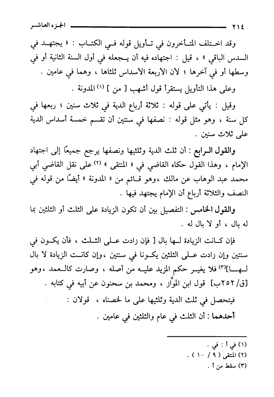 والقول الرابع: أن ثلث الدية وثلثيها ونصفها يرجع جميعًا إلى اجتهاد الإِمام، وهذا القول حكاه القاضي في "المنتقى" (¬2) على نقل القاضي أبي محمَّد عبد الوهاب عن مالك، وهو قائم من "المدونة" أيضًا من قوله في النصف والثلاثة أرباع أن الإِمام يجتهد فيها.