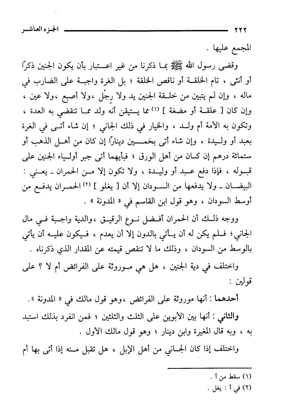 واختلف في دية الجنين، هل هي موروثة على الفرائض أم لا؟ على قولين: