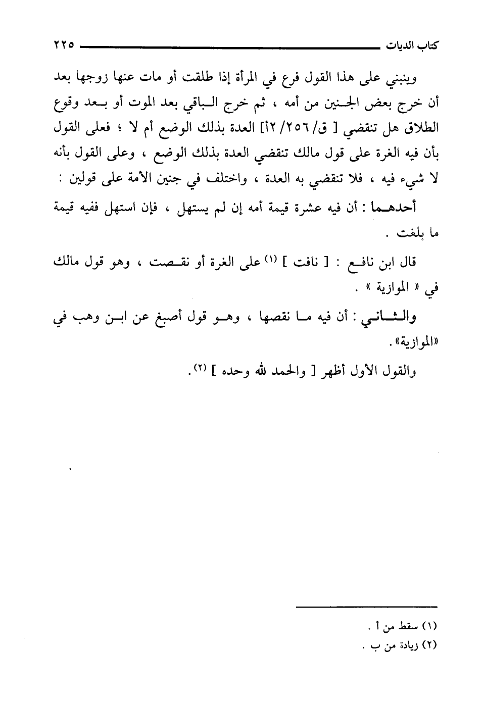 وينبني على هذا القول فرع في المرأة إذا طلقت أو مات عنها زوجها بعد أن خرج بعض الجنين من أمه، ثم خرج الباقي بعد الموت أو بعد وقوع الطلاق هل تنقضي العدة بذلك الوضع أم لا؛ فعلى القول بأن فيه الغرة على قول مالك تنقضي العدة بذلك الوضع، وعلى القول بأنه لا شيء فيه، فلا تنقضي به العدة، واختلف في جنين الأمة على قولين: