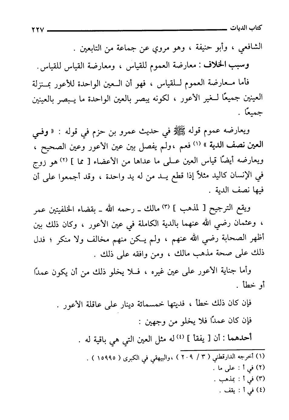 ويعارضه عموم قوله - صلى الله عليه وسلم - في حديث عمرو بن حزم في قوله: "وفي العين نصف الدية" (¬1) فعم، ولم يفصل بين عين الأعور وعين الصحيح، ويعارضه أيضًا قياس العين على ما عداها من الأعضاء [مما] (¬2) هو زوج في الإنسان كاليد مثلًا إذا قطع يد من له يد واحدة، وقد أجمعوا على أن فيه نصف الدية.