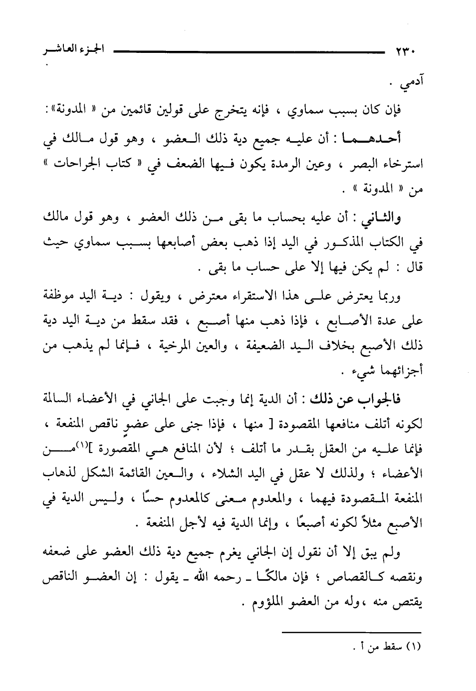 ولم يبق إلا أن نقول إن الجاني يغرم جميع دية ذلك العضو على ضعفه ونقصه كالقصاص؛ فإن مالكًا -رحمه الله- يقول: إن العضو الناقص يقتص منه، وله من العضو الملؤوم.