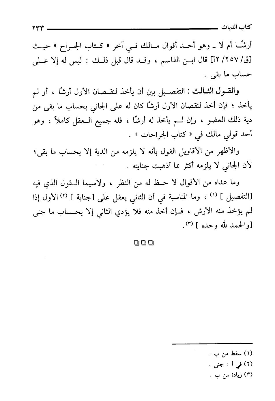 أرشًا أم لا- وهو أحد أقوال مالك في آخر "كتاب الجراح" حيث قال ابن القاسم، وقد قال قبل ذلك: ليس له إلا على حساب ما بقى.