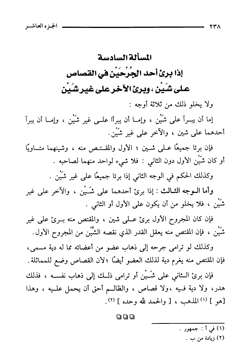 المسألة السادسة إذا برئ أحد الجُرْحَيْن في القصاص على شَيْن، وبرئ الآخر على غير شَيْن