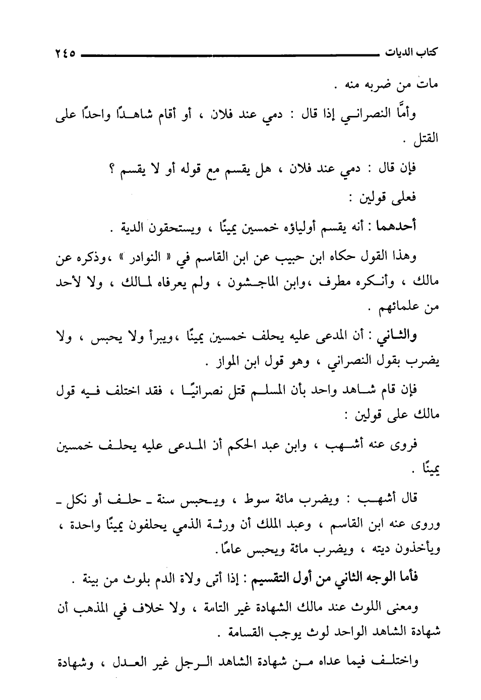 والثاني: أن المدعى عليه يحلف خمسين يمينًا، ويبرأ ولا يحبس، ولا يضرب بقول النصراني، وهو قول ابن المواز.