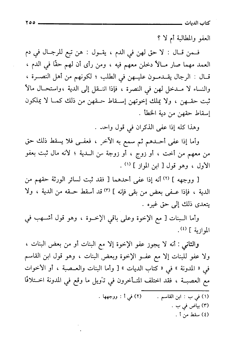 والثاني: أنه لا يجوز عفو الإخوة إلا مع البنات أو من بعض البنات، ولا عفو للبنات إلا مع عفو الإخوة وبعض البنات، وهو قول ابن القاسم في "المدونة" في "كتاب الديات" [وأما البنات والعصبة، أو الأخوات مع العصبة، فقد اختلف المتأخرون في تأويل ما وقع في المدونة اختلافًا