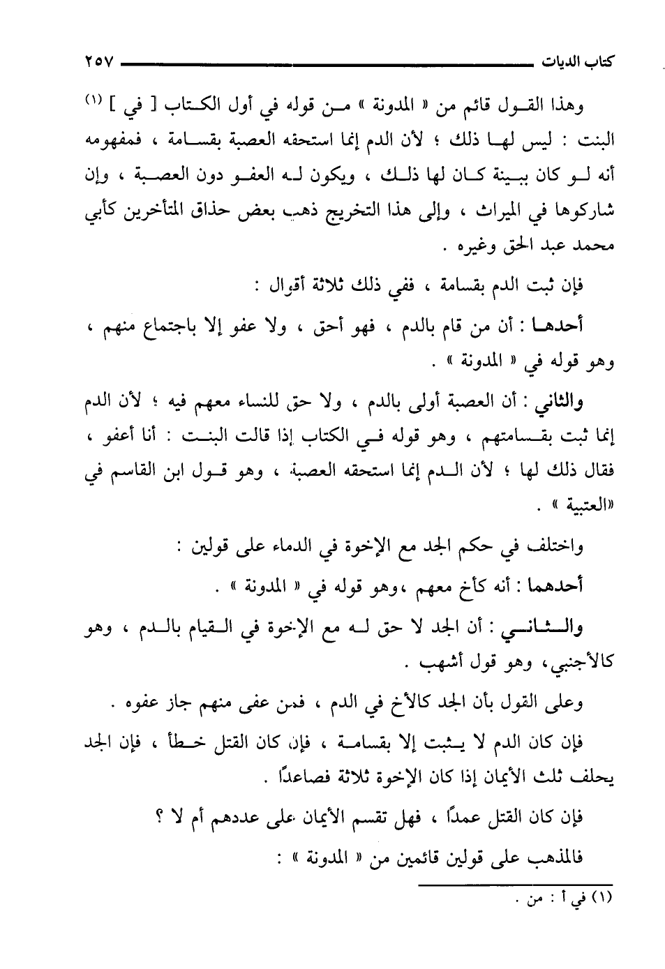 وهذا القول قائم من "المدونة" من قوله في أول الكتاب [في] (¬1) البنت: ليس لها ذلك؛ لأن الدم إنما استحقه العصبة بقسامة، فمفهومه أنه لو كان ببينة كان لها ذلك، ويكون له العفو دون العصبة، وإن شاركوها في الميراث، وإلى هذا التخريج ذهب بعض حذاق المتأخرين كأبي محمَّد عبد الحق وغيره.
