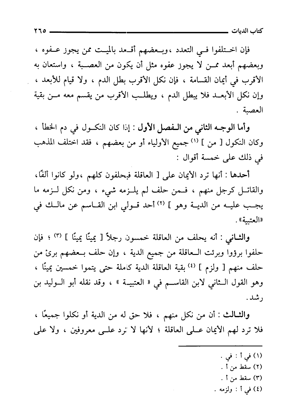 والثالث: أن من نكل منهم، فلا حق له من الدية أو نكلوا جميعًا، فلا ترد له الأيمان على العاقلة؛ لأنها لا ترد على معروفين، ولا على