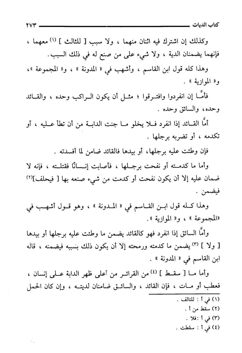 وأمَّا السائق إذا انفرد فهو كالقائد يضمن ما وطئت عليه برجلها أو بيدها [ولا] (¬3) يضمن ما كدمته ورمحته إلا أن يكون ذلك بسببه فيضمنه، قاله ابن القاسم في "المدونة".