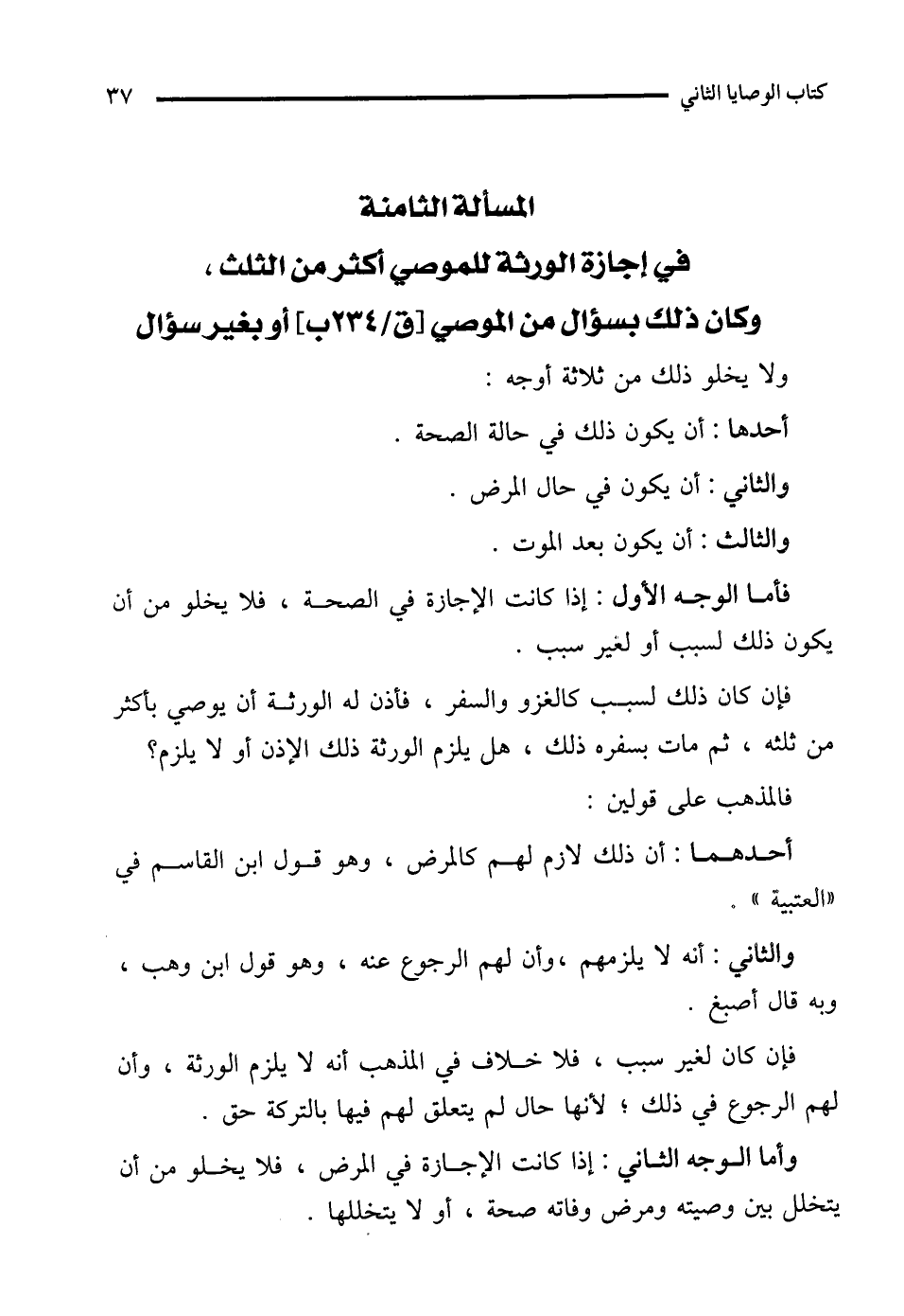 المسألة الثامنة في إجازة الورثة للموصي أكثر من الثلث، وكان ذلك بسؤال من الموصي أو بغير سؤال