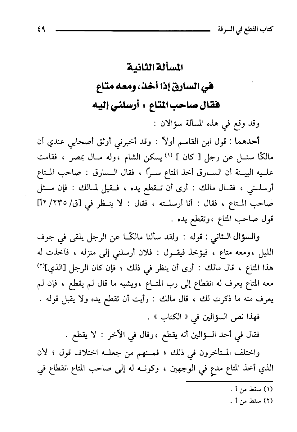 المسألة الثانية في السارق إذا أخذ، ومعه متاع فقال صاحب المتاع: أرسلني إليه