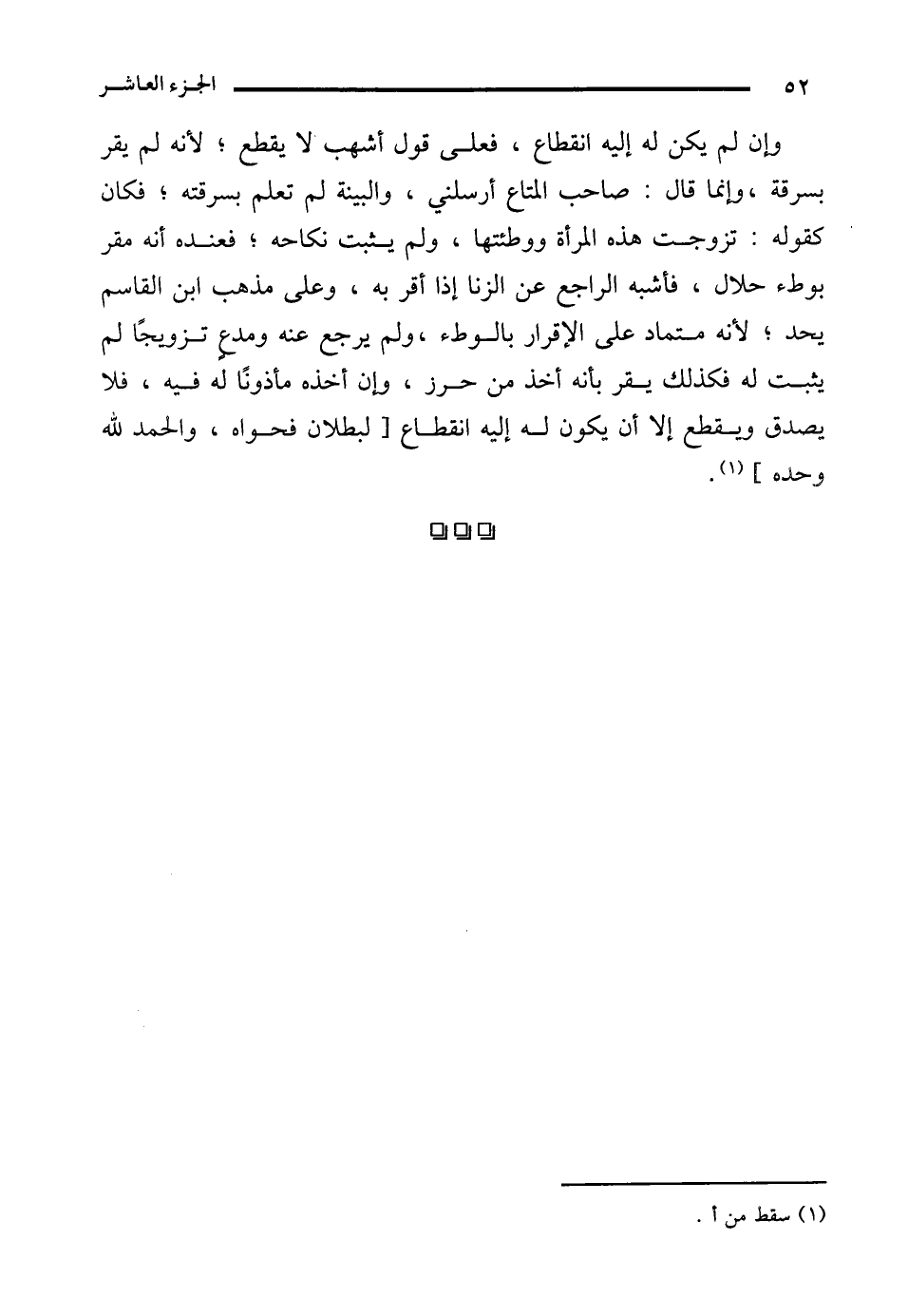 وإن لم يكن له إليه انقطاع، فعلى قول أشهب لا يقطع؛ لأنه لم يقر بسرقة، وإنما قال: صاحب المتاع أرسلني، والبينة لم تعلم بسرقته؛ فكان كقوله: تزوجت هذه المرأة ووطئتها، ولم يثبت نكاحه؛ فعنده أنه مقر بوطء حلال، فأشبه الراجع عن الزنا إذا أقر به، وعلى مذهب ابن القاسم يحد؛ لأنه متماد على الإقرار بالوطء، ولم يرجع عنه ومدعٍ تزويجًا لم يثبت له فكذلك يقر بأنه أخذ من حرز، وإن أخذه مأذونًا له فيه، فلا يصدق ويقطع إلا أن يكون له إليه انقطاع [لبطلان فحواه، والحمد لله وحده] (¬1).