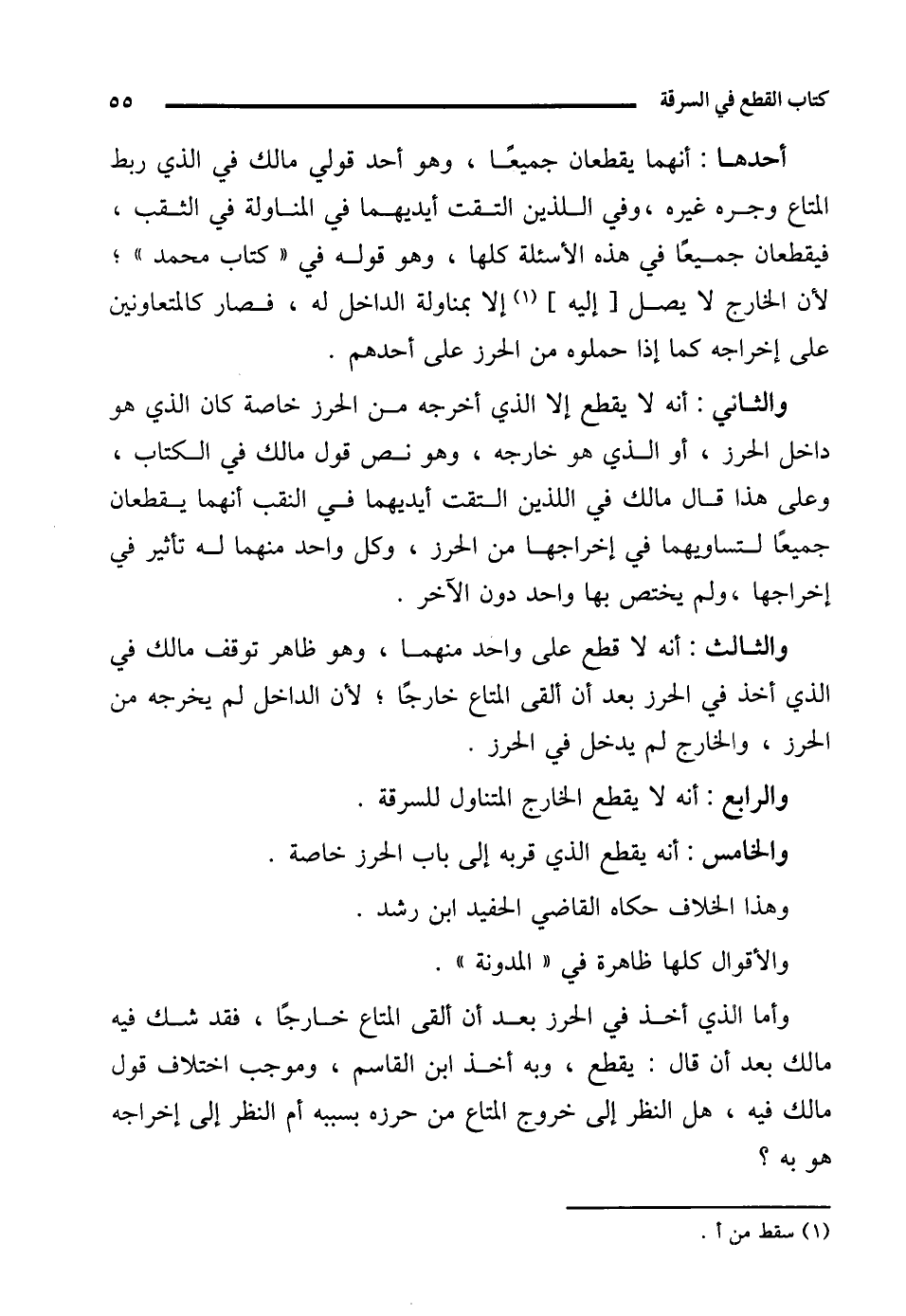 والثاني: أنه لا يقطع إلا الذي أخرجه من الحرز خاصة كان الذي هو داخل الحرز، أو الذي هو خارجه، وهو نص قول مالك في الكتاب، وعلى هذا قال مالك في اللذين التقت أيديهما في النقب أنهما يقطعان جميعًا لتساويهما في إخراجها من الحرز، وكل واحد منهما له تأثير في إخراجها، ولم يختص بها واحد دون الآخر.