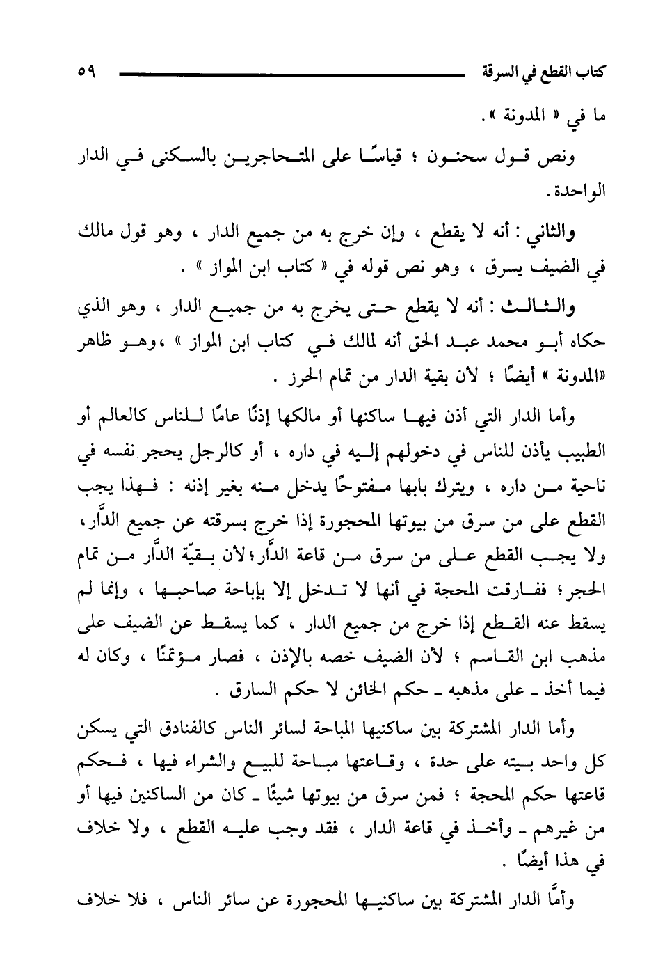 وأما الدار التي أذن فيها ساكنها أو مالكها إذنًا عامًا للناس كالعالم أو الطبيب يأذن للناس في دخولهم إليه في داره، أو كالرجل يحجر نفسه في ناحية من داره، ويترك بابها مفتوحًا يدخل منه بغير إذنه: فهذا يجب القطع على من سرق من بيوتها المحجورة إذا خرج بسرقته عن جميع الدَّار، ولا يجب القطع على من سرق من قاعة الدَّار؛ لأن بقيّة الدَّار من تمام الحجر؛ ففارقت المحجة في أنها لا تدخل إلا بإباحة صاحبها، وإنما لم يسقط عنه القطع إذا خرج من جميع الدار، كما يسقط عن الضيف على مذهب ابن القاسم؛ لأن الضيف خصه بالإذن، فصار مؤتمنًا، وكان له فيما أخذ -على مذهبه- حكم الخائن لا حكم السارق.