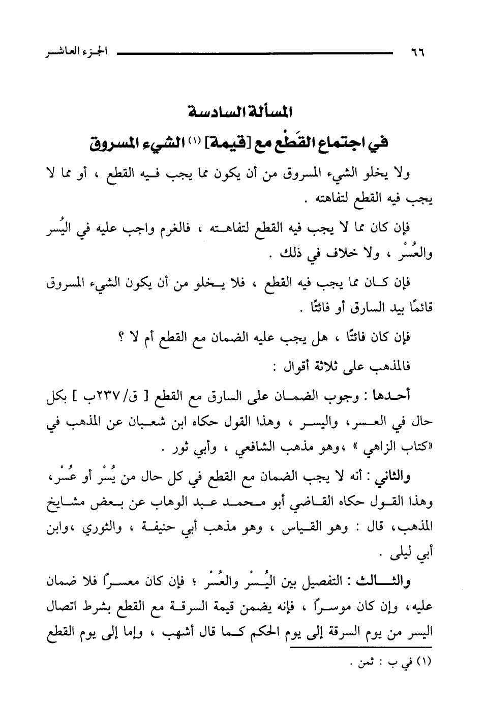 المسألة السادسة في اجتماع القَطْع مع [قيمة] (¬1) الشيء المسروق