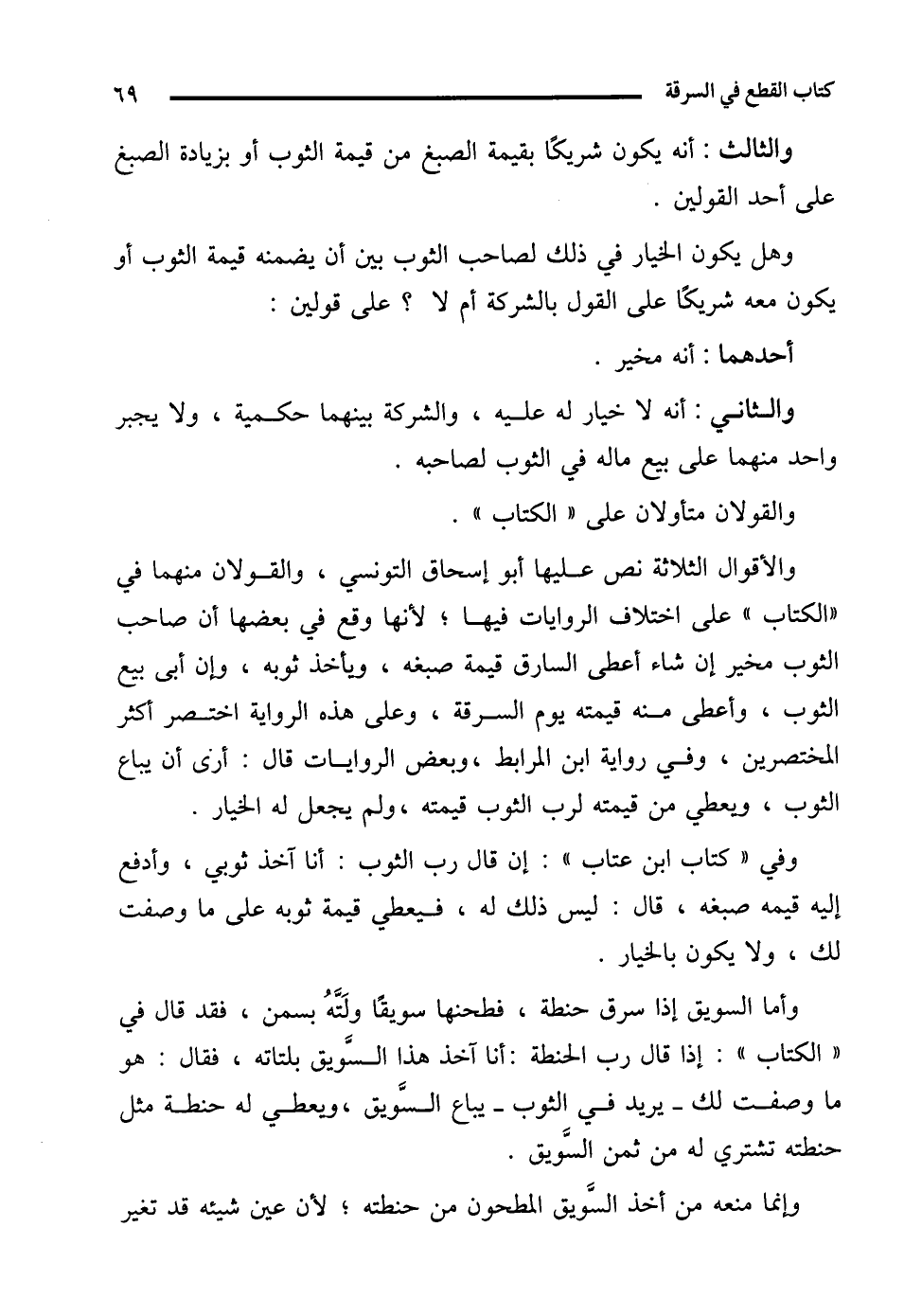 والأقوال الثلاثة نص عليها أبو إسحاق التونسي، والقولان منهما في "الكتاب" على اختلاف الروايات فيها؛ لأنها وقع في بعضها أن صاحب الثوب مخير إن شاء أعطى السارق قيمة صبغه، ويأخذ ثوبه، وإن أبى بيع الثوب، وأعطى منه قيمته يوم السرقة، وعلى هذه الرواية اختصر أكثر المختصرين، وفي رواية ابن المرابط، وبعض الروايات قال: أرى أن يباع الثوب، ويعطي من قيمته لرب الثوب قيمته، ولم يجعل له الخيار.