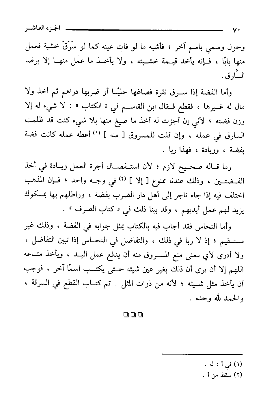 وأما النحاس فقد أجاب فيه بالكتاب بمثل جوابه في الفضة، وذلك غير مستقيم؛ إذ لا ربا في ذلك، والتفاضل في النحاس إذا تبين التفاضل، ولا أدري لأي معنى منع المسروق منه أن يدفع عمل اليد، ويأخذ متاعه اللهم إلا أن يرى أن ذلك بغير عين شيئه حتى يكتسب اسمًا آخر، فوجب أن يأخذ مثل شيئه؛ لأنه من ذوات المثل. تم كتاب القطع في السرقة، والحمد لله وحده.