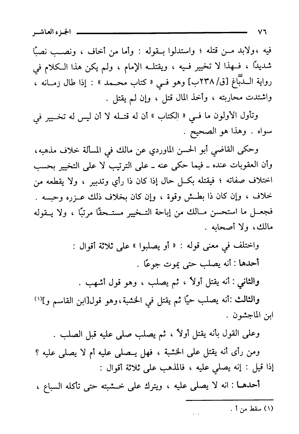 وحكى القاضي أبو الحسن الماوردي عن مالك في المسألة خلاف مذهبه، وأن العقوبات عنده -فيما حكى عنه- على الترتيب لا على التخيير بحسب اختلاف صفاته؛ فيقتله بكل حال إذا كان ذا رأي وتدبير، ولا يقطعه من خلاف، وإن كان ذا بطش وقوة، وإن كان بخلاف ذلك عزره وحبسه.
