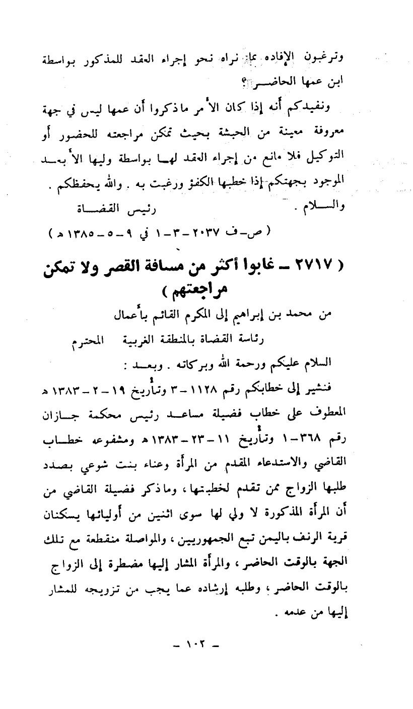 فنشير إلى خطابكم رقم 1128-3 وتاريخ 19-2-1383هـ المعطوف على خطاب فضيلة مساعد رئيس محكمة جازان رقم 368-1 وتاريخ 11-23-1383هـ ومشفوعة خطاب القاضي والاستدعاء المقدم من المرأة وعناء بنت شوعي بصدد طلبها الزوج ممن تقدم لخطبتها، وما ذكر فضيلة القاضي من أن المرأة المذكورة لا ولي لها سوى اثنين من أوليائها يسكنان قرية الرنف باليمن تبع الجمهوريين، والمواصلة منقطعة مع تلك الجهة بالوقت الحاضر، والمرأة المشار إليها مضطرة إلى الزواج بالوقت الحاضر، والمرأة المشار إليها مضطرة إلى الزواج بالوقت الحاضر، وطلبه إرشاده عما يجب من تزويجه للمشار إليها من عدمه.