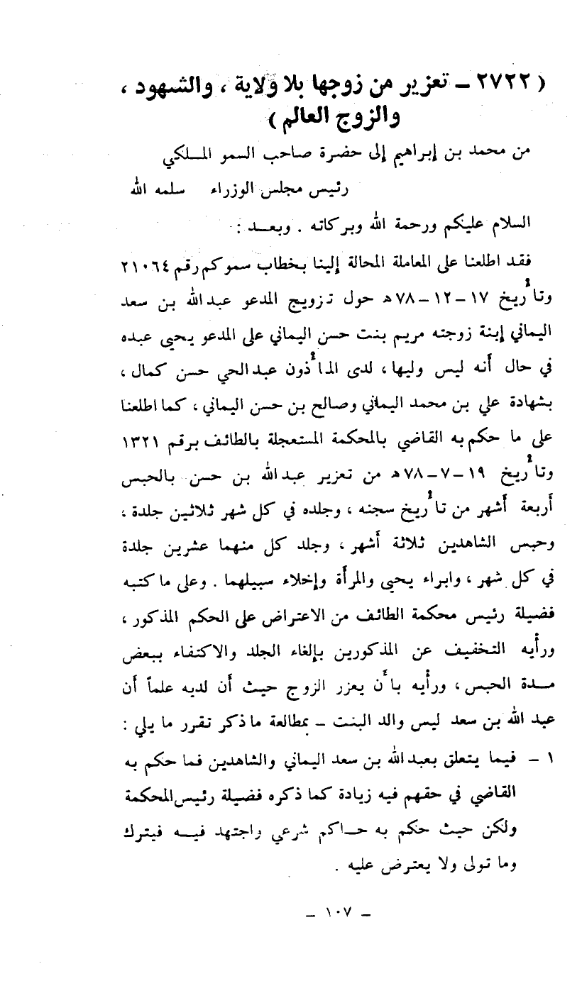 فقد اطلعنا على المعاملة المحالة إلينا بخطاب سموكم رقم 21064 وتاريخ 17-12-78هـ حول تزويج المدعو عبد الله بن سعد اليماني ابنة زوجته مريم بنت حسن اليماني على المدعو يحي عبده في حال أنه ليس وليها، لدى المأذون عبد الحي حسن كمال بشهادة علي بن محمد اليماني وصالح بن حسن اليماني، كما اطلعنا على ما حكم به القاضي بالمحكمة المستعجلة بالطائف برقم 1321 وتاريخ 19-7-78هـ من تعزير عبد الله بن حسن بالحبس أربعة أشهر من تاريخ سجنه وجلده في كل شهر ثلاثين جلدة، وحبس الشاهدين ثلاثة أشهر، وجلد كل منهما عشرين جلدة في كل شهر وإبراء يحي والمرأة وإخلاء سبيلهما. وعلى ما كتبه فضيلة رئيس محكمة الطائف من الاعتراض على الحكم المذكور، ورأيه التخفيف عن المذكورين بإلغاء الجلد والاكتفاء ببعض مدة الحبس، ورأيه بأن يعزر الزوج حيث أن لديه علماً أن عبد الله بن سعد ليس والد البنت - بمطالعة ما ذكر تقرر ما يلي: