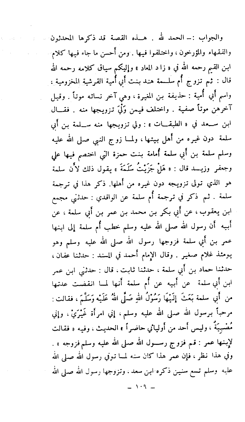 والجواب: الحمد لله. هذه القصة قد ذكرها المحدثون والفقهاء والمؤرخون، واختلفوا فيها. ومن أحسن ما جاء فيها كلام ابن القيم رحمه الله في (زاد المعاد) وإليكم سياق كلامه رحمه الله قال: ثم تزوج أم سلمة هند بنت أبي أمية القرشية المخزومية، واسم أبي أمية: حذيفة بن المغيرة، وهي آخر نسائه موتاً. وقبل آخرهن موتاً صفية. واختلف فيمن ولى تزويجها منه. فقال ابن سعد في (الطبقات) ولى تزويجها منه سلمة بن أبي سنة دون غيره من أهل بيتها. ولما زوج النبي صلى الله عليه وسلم سلمة بن أبي سلمة أمامة بنت حمزة التي اختصم فيها علي وجعفر وزيد قال: (هل جزيت سلمة) يقول ذلك لأن سلمة هو الذي تولى تزويجه دون غيره من أهلها. ذكر هذا في ترجمة سلمة. ثم ذكر في ترجمة أم سلمة عن الواقدي: حدثني مجمع ابن يعقوب، عن أبي بكر بن محمد بن عمر بن أبي سلمة إلى ابنها عمر بن ابي سلمة فزوجها رسول الله صلى الله عليه وسلم وهو يومئذ غلام صغير. وقال الإمام أحمد في المسند: حدثنا عفان، حدثنا حماد بن أبي سلمة، حدثنا ثابت قال: حدثني ابن عمر ابن أبي سلمة عن أبيه عن أم سلمة أنها لما انقضت عدتها من أبي سلمة بعث إليها رسول الله صلى الله عليه وسلم فقالت: (مرحباً برسول الله صلى الله عليه وسلم، إني امرأة غيري. وإني مصبيه، وليس أحد من أوليائي حاضراً) الحديث. وفيه (فقالت لابنها عمر: قم فزوج رسول الله صلى الله عليه وسلم فزوجه.