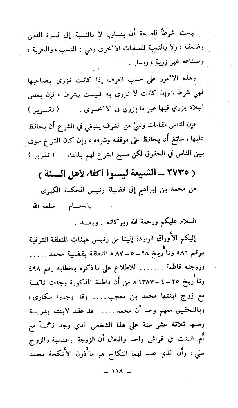 وزوجته فاطمة ... للإطلاع على ما ذكره بخطابه رقم 498 وتاريخ 25-4-1387هـ من أن فاطمة المذكورة وجدت نائمة مع زوج ابنتها محمد بن معجب ... وقد وجدوا سكارى وبالتحقيق معهم وجد أن محمد ... قد عقد لابنته بدرية وسنها ثلاثة عشر سنة على هذا الشخص الذي وجد نائماً مع أم البنت في فراش واحد والحال أن الزوجة رافضية والزوج سني. وأن الذي عقد لهما النكاح هو مأذون الأنكحة محمد