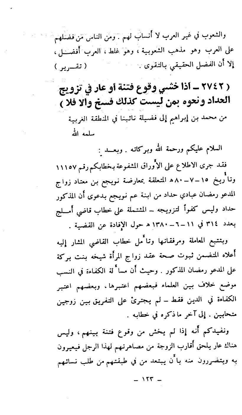 وبتتبع المعاملة ومرفقاتها وتأمل خطاب القاضي المشار إليه أعلاه المتضمن ثبوت صحة عقد زواج المرأة شيخة بنت بركة على المدعو رمضان المذكور. وحيث أن مسألة الكفاءة في النسب موضع خلاف بين العلماء فبعضهم اعتبرها، وبعضهم اعتبر الكفاءة في الدين فقط- لم يجترئ على التفريق بين زوجين متحابين. إلى آخر ما ذكره في خطابه.