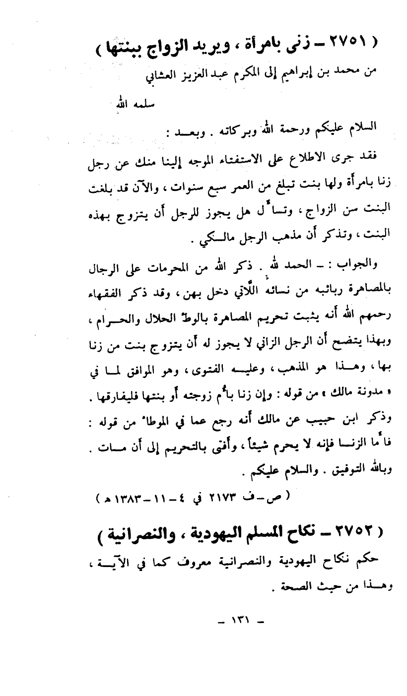 فقد جرى الاطلاع على الاستفتاء الموجه إلينا منك عن رجل زنا بامرأة ولها بنت تبلغ من العمر سبع سنوات، والآن قد بلغت البنت سن الزواج، وتسأل هل يجوز للرجل أن يتزوج بهذه البنت. وتذكر أن مذهب الرجل مالكي.
