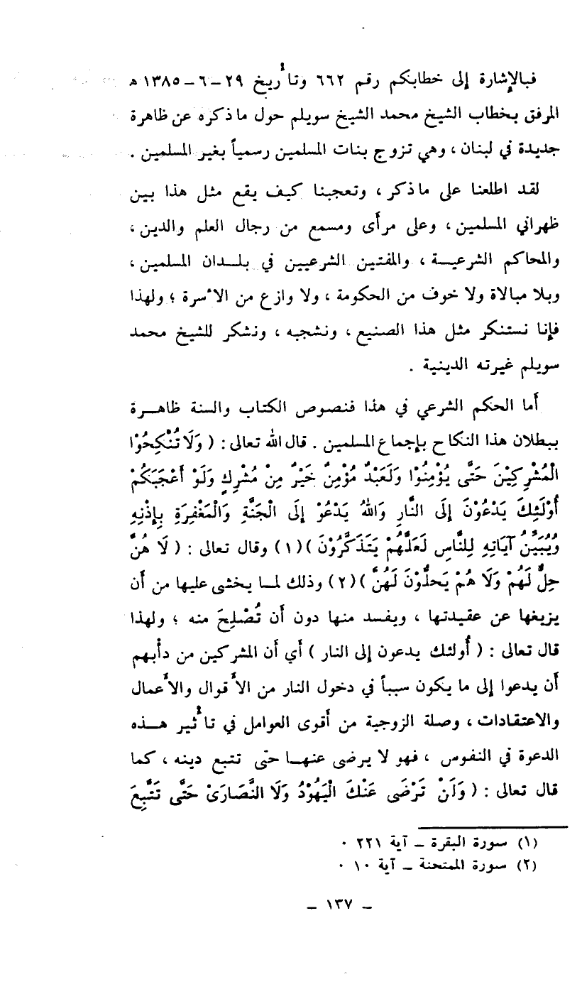 فبالإشارة إلى خطابكم رقم 662 وتاريخ 29-6-1385هـ المرفق بخطاب الشيخ محمد الشيخ سويلم حول ما ذكره عن ظاهرة جديدة في لبنان، وهي تزوج بنات المسلمين رسمياً بغير المسلمين.