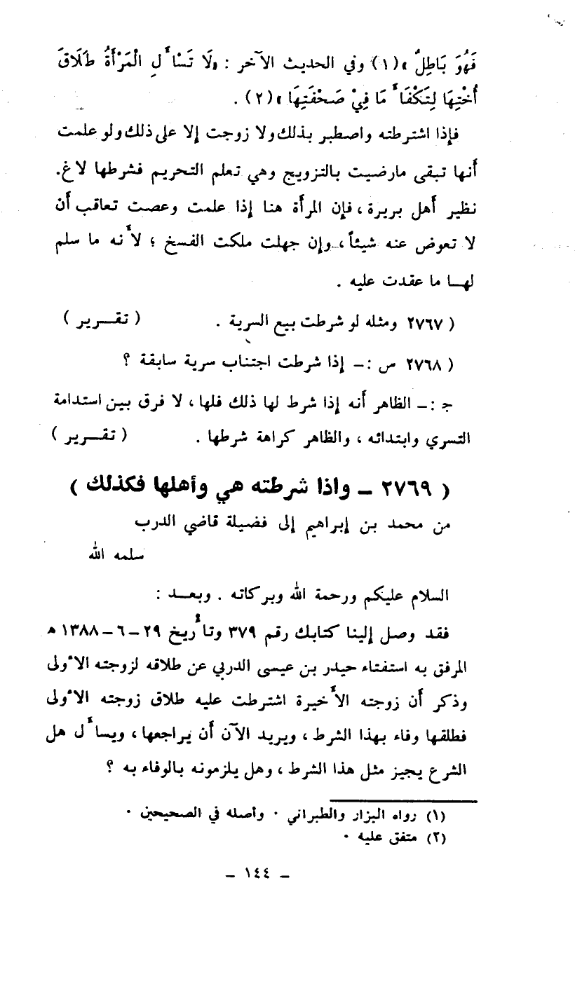 فقد وصل إلينا كتابك رقم 379 وتاريخ 29-6-1388هـ المرفق به استفتاء حيدر بن عيسى الدربي عن طلاقه لزوجته الأولى وذكر أن زوجته الأخيرة اشترطت عليه طلاق زوجته الأولى فطلقها وفاء بهذا الشرط، ويريد الآن أن يراجعها، ويسأل هل الشرع يجيز مثل هذا الشرط، وهل يلزمونه بالوفاء به؟