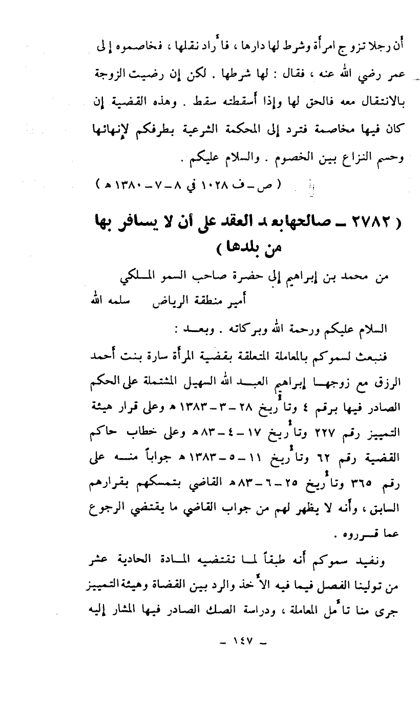 فنبعث لسموكم بالمعاملة المتعلقة بقضية المرأة سارة بنت أحمد الرزق مع زوجها إبراهيم العبد الله السهيل المشتملة على الحكم الصادر فيها برقم 4 وتاريخ 28-3-1383هـ وعلى قرار هيئة التمييز برقم 227 وتاريخ 17-4-83هـ وعلى خطاب حاكم القضية رقم 62 وتاريخ 11-5-1383هـ جواباً منه على رقم 365 وتاريخ 25-6-83هـ القاضي بتمسكهم بقرارهم السابق، وأنه لا يظهر لهم من جواب القاضي ما يقتضي الرجوع عما قرروه.