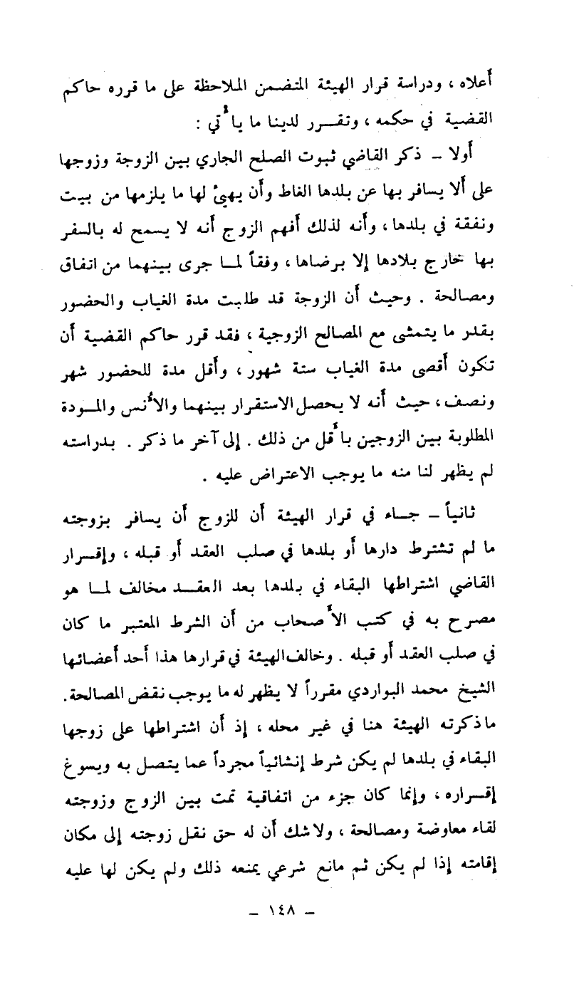 ثانياً: جاء في قرار الهيئة أن للزوج أن يسافر بزوجته ما لم تشترط دارها أو بلدها في صلب العقد أو قبله، وإقرار القاضي اشتراطها البقاء في بلدها بعد العقد مخالف لما هو مصرح به في كتب الأصحاب من أن الشرط المعتبر ما كان في صلب العقد أو قبله. وخالف الهيئة في قرارها هذا أحد أعضائها الشيخ محمد البواردي مقرراً لا يظهر له ما يوجب نقض المصالحة. ما ذكرته الهيئة هنا في غير محله، إذ أن اشتراطها على زوجها البقاء في بلدها لم يكن شرط إنشائياً مجرداً عما يتصل به ويسوغ إقراره، وإنما كان جزء من اتفاقية تمت بين الزوج وزوجته لقاء معاوضة ومصالحة، ولا شك أن له حق نقل زوجته إلى مكان إقامته إذا لم يكن ثم مانع شرعي يمنعه ذلك ولم يكن لها عليه