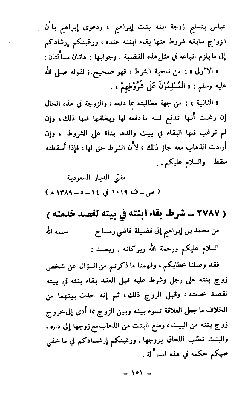 عباس بتسليم زوجة ابنه بنت إبراهيم، ودعوى إبراهيم بأن الزواج سابقة شروط منها بقاء ابنته عنده، ورغبتكم إرشادكم إلى ما يلزم اتباعه في مثل هذه القضية. وجوابها: هاتان مسألتان: