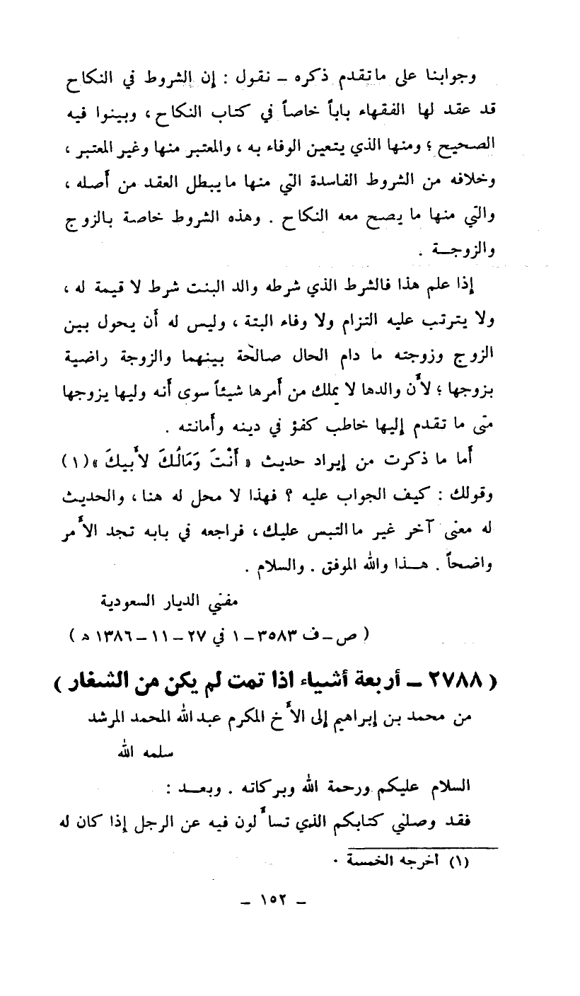 وجوابنا على ما تقدم ذكره - نقول إن الشروط في النكاح قد عقد لها الفقهاء باباً خاصاً في كتاب النكاح، وبينوا فيه الصحيح، ومنها الذي يتعين الوفاء به، والمعتبر منها وغير المعتبر. وخلافه من الشروط الفاسدة التي منها ما يبطل العقد من أصله، والتي منها ما يصح معه النكاح. وهذه الشروط خاصة بالزوج والزوجة.