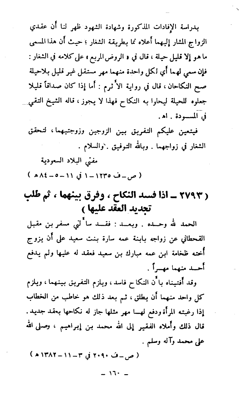 الحمد لله وحده وبعد: فقد سألني مسفر بن مقبل القحطاني عن زواجه بابنة عمه سارة بنت سعيد على أن يزوج أخته ضخامة ابن عمه مبارك بن سعيد فعقد له عليها ولم يدفع أحد منهما مهراً.