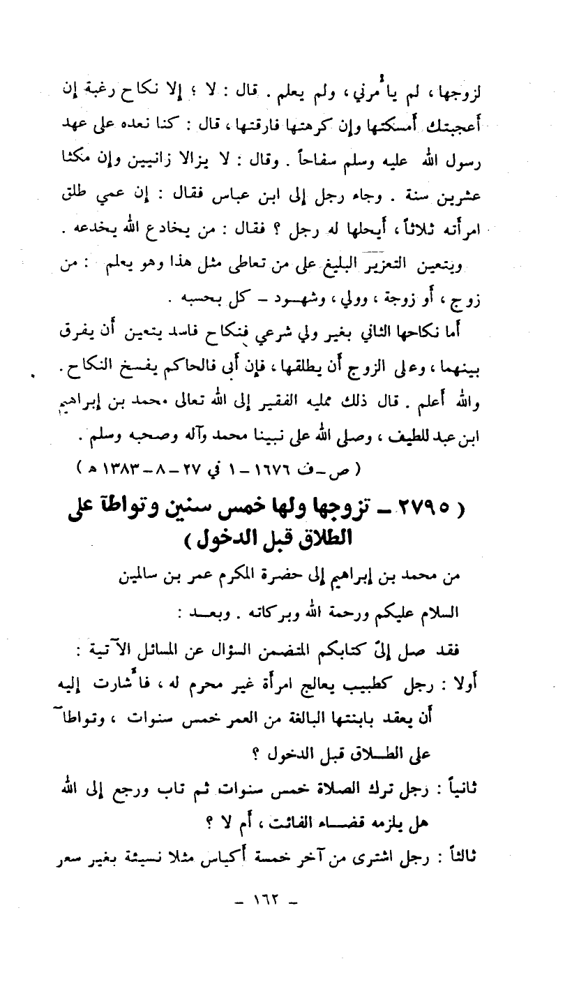 أما نكاحها الثاني بغير ولي شرعي فنكاح فاسد يتعين أن يفرق بينهما، وعلى الزوج أن يطلقها، فإن أبى الحاكم يفسخ النكاح. والله أعلم. قال ذلك ممليه الفقير إلى الله تعالى محمد بن إبراهيم ابن عبد اللطيف. وصلى الله علي نبينا محمد وآله وصحبه وسلم.