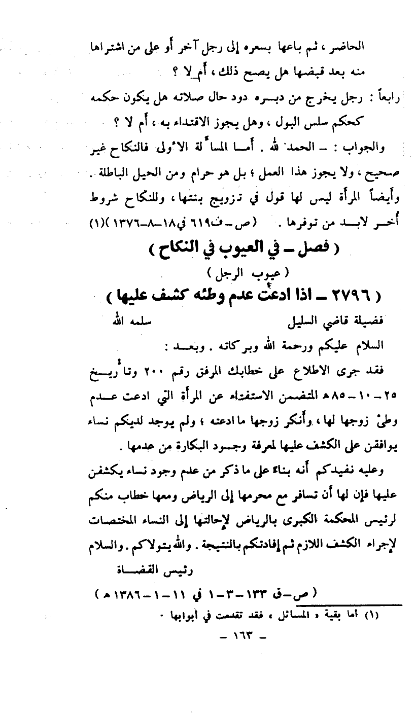 فقد جرى الإطلاع على خطابك المرفق رقم 200 وتاريخ 25-10-85هـ المتضمن الاستفتاء عن المرأة التي ادعت عدم وطئ زوجها لها، وأنكر زوجها ما ادعته، ولم يوجد لديكم نساء يوافقن على الكشف عليها لمعرفة وجود البكارة من عدمها.