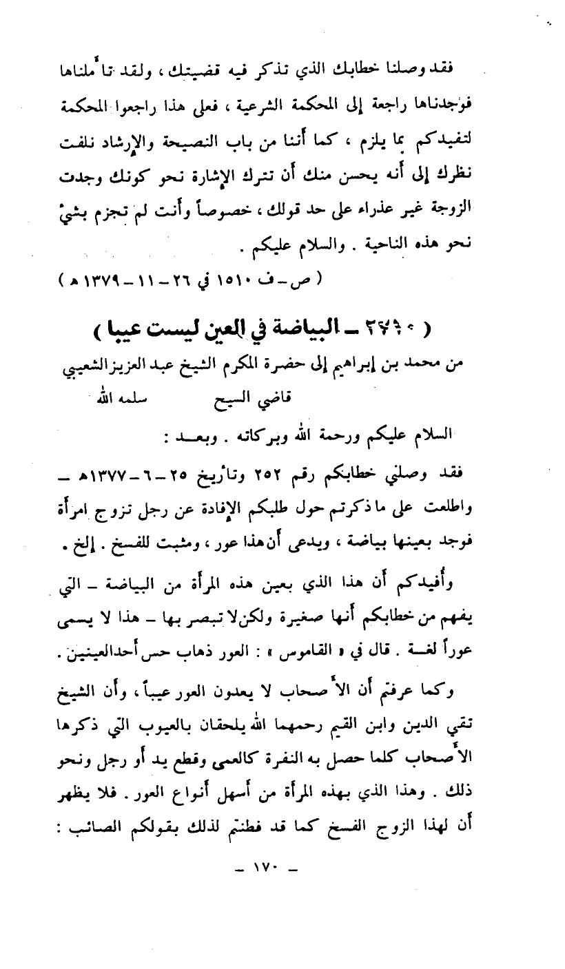 فقد وصلني خطابكم رقم 250 وتاريخ 25-6-1377هـ واطلعت على ما ذكرتم حول طلبكم الإفادة عن رجل تزوج امرأة فوجد بعينها بياضة، ويدعي أن هذا عور، ومثبت للفسخ.. إلخ.