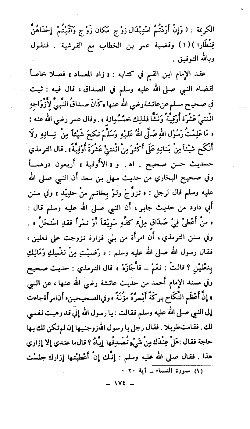الكريمة: (وإن أردتم استبدال زوج وأتيتم إحداهن قنطاراً) (¬1) وقضية عمر بن الخطاب مع القرشية. فنقول وبالله التوفيق.