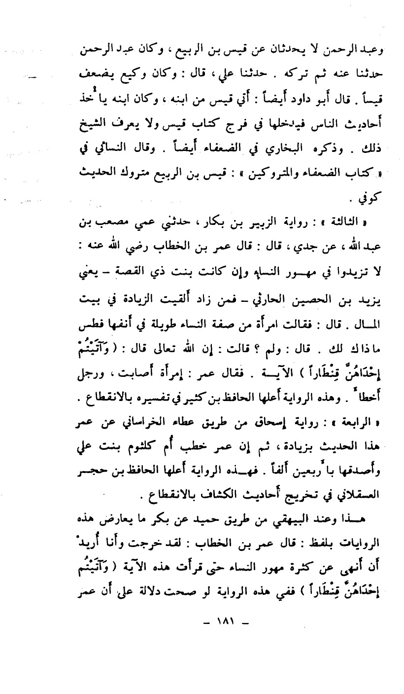 الثالثة: رواية الزبير بن بكار، حدثني عمي مصعب بن عبد الله، عن جدي قال: قال عمر بن الخطاب رضي الله عنه: لا تزيدوا في مهور النساء وإن كانت بنت ذي القصة -يعني يزيد بن الحصين الحارثي- فمن زاد ألقيت الزيادة في بيت المال. قال: فقالت امرأة من صفة النساء طويلة في أنفها فطس ما ذاك لك. قال: ولم؟ قالت: إن الله تعالى قال: {وآتيتم إحداهن قنطاراً} الآية. فقال عمر: امرأة أصابت، ورجل أخطأ. وهذه الرواية أعلها الحافظ بن كثير في تفسيره بالانقطاع.