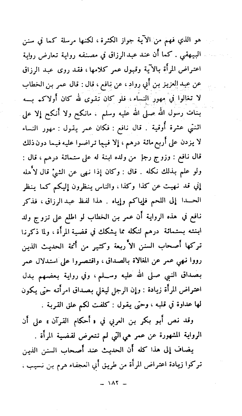 هو الذي فهم من الآية جواز الكثرة، لكنها مرسلة كما في سنن البيهقي. كما أن عبد الرزاق في مصنفه رواية تعارض رواية اعتراض المرأة بالآية وقبول عمر كلامها، فقد روى عبد الرزاق عن عبد العزيز بن أبي داود، عن نافع، قال: قال عمر بن الخطاب لا تغالوا في مهور النساء، فلو كان تقوى الله كان أولاكم به بنات رسول الله صلى الله عليه وسلم، ما نكح ولا أنكح إلا على اثنتي عشرة أوقية. قال نافع: فكان عمر يقول: مهور النساء لا يزدن على أربع مائة درهم، إلا فيما تراضوا عليه فيما دون ذلك، قال نافع: فكان عمر يقول: مهور النساء لا يزدن على أربع مائة درهم، إلا فيما تراضوا عليه فيما دون ذلك قال نافع وزوج رجل من لده ابنة له على ستمائة درهم. قال: ولو علم بذلك نكله. قال: وكان إذا نهى عن الشيء قال لأهله إني قد نهيت عن كذا وكذا، والناس ينظرون إليكم كما ينظر الحدا إلى اللحم فإياكم وإياه. هذا لفظ عبد الرزاق، فذكر نافع في هذه الرواية أن عمر بن الخطاب لو اطلع على تزوج ولد ابنته بستمائة درهم لنكله مما يشكك في قضية المرأة. ولما ذكرنا تركها أصحاب السنن الأربعة كثير من أئمة الحديث الذين رووا نهي عمر عن المغالاة بالصداق، واقتصروا على استدلال عمر بصداق النبي صلى الله عليه وسلم، وفي رواية بعضهم بدل اعتراض المرأة زيادة: وإن الرجل ليغلي بصداق امرأته حتى يكون لها عداوة في قلبه، وحتى يقول: كلفت لكم علق القربة.